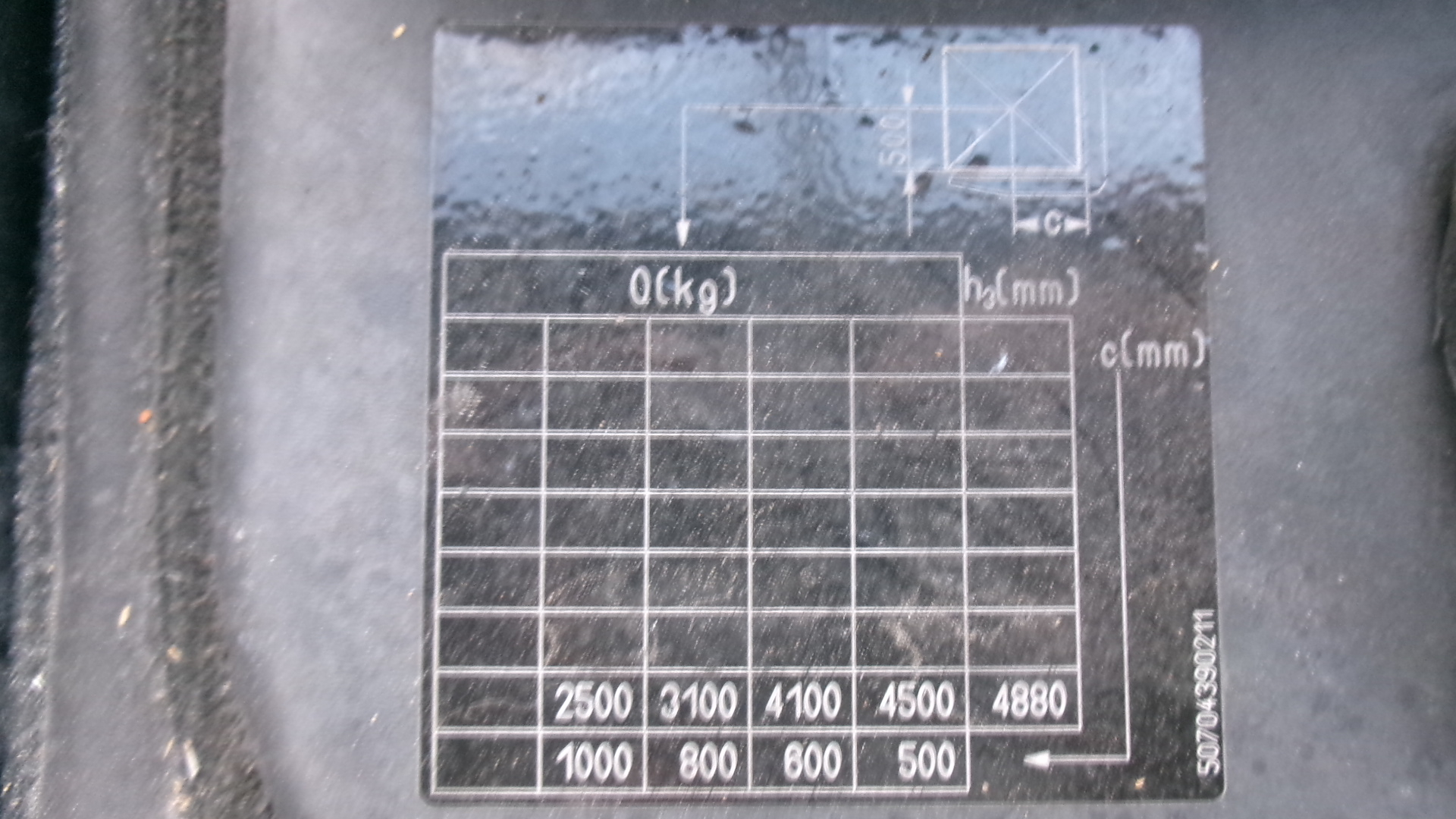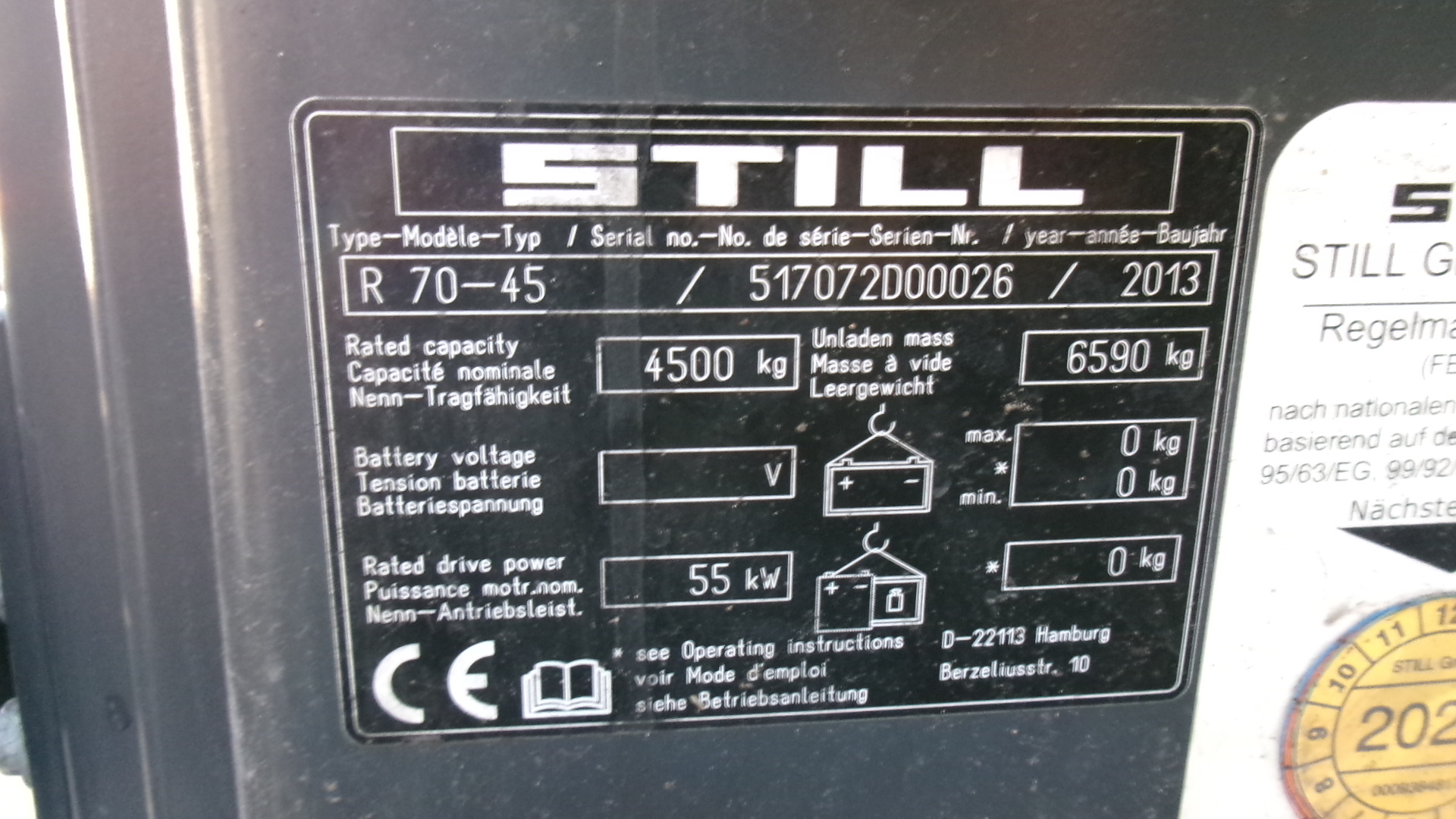 Modell/Typ: Still R70-45Herstellungsjahr: 2013Staplertyp:FrontstaplerWenderadius: 2730mmMotorleistung (kW): 55Hubhöhe (mm): 4880Gabellänge (mm): 1200mmFreihub (mm): 160Bauhöhe (mm): 3250Betriebsbreite (mm): 1506Hubgerüst: Teleskop-Freisicht Länge Gabelzinken: 1200mmBreite Gabelzinken: 150mmBedienung Hub: HydraulischTragfähigkeit (kg): 4500Eigengewicht (kg): 6590Betriebsstunden: 10680